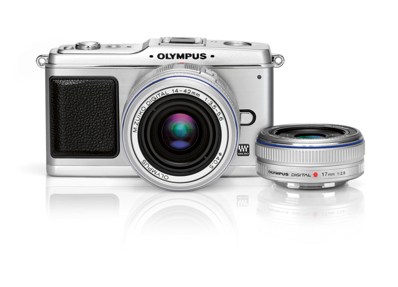 (E-P1 váz ezüst színben, M. ZUIKO DIGITAL ED 14-42mm 1:3.5-5.6 objektív ezüst színben, M. ZUIKO DIGITAL 17mm 1:2.8 Pancake fix fókuszú objektív ezüst színben, VF-1 kereső)