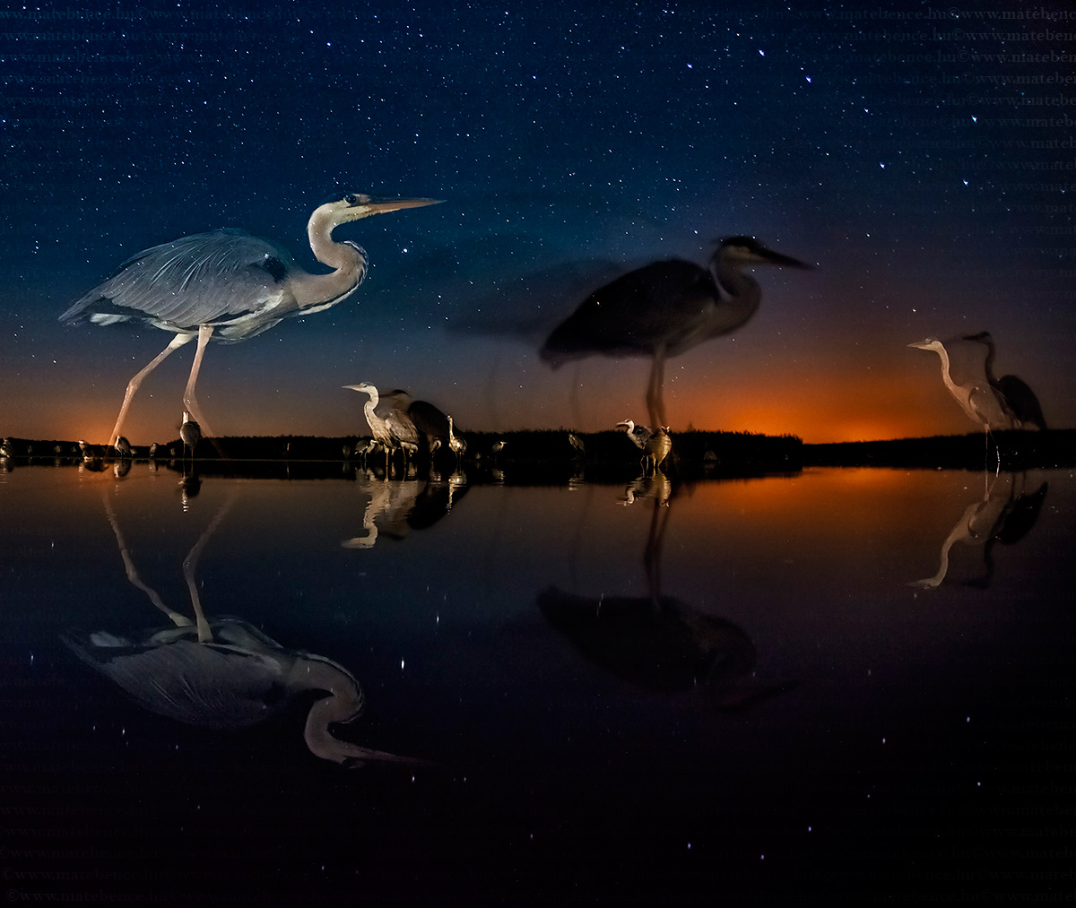Olyan helyet figyeltem ki lesemnek, ahol a korábbi években éjszaka is láttam a madarakat tartózkodni. A képet állványra helyezett fényképezőgéppel, kézzel készítettem, nem pedig távirányítással, ezért rendkívüli elővigyázatosságra volt szükség a lesben való tartózkodáshoz, hiszen a legkisebb fény- vagy hanghatással is elzavartam volna a gémeket. A szürke gémek az egyik legfélénkebb madarak azon a területen ahol a kép készült, ezért nehéz feladat volt a halszemobjektív perspektívájából egy méternél közelebbről fotózni őket.
